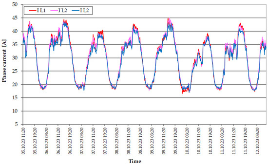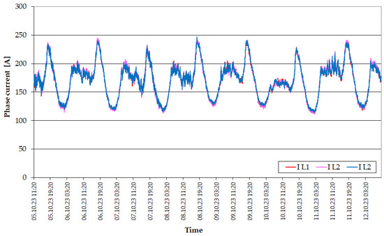 In order to verify the power losses occurring on HV/MV transformers, measurements of the volatility of the basic load parameters of both transformers occurring at the examined power station were also made. The registered course of currents in individual phases of the TR-1 transformer is shown in Figure 9. As in the case of the line load, the TR-1 transformer current showed daily variability depending on the time of day.