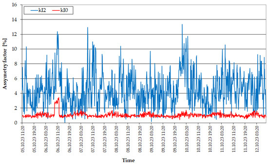 Although the currents shown in Figure 5 do not show noticeable shifts between phases, the values of the asymmetry coefficients reach significant values. As it can be observed in Figure 6, the average value of the coefficient of opposite asymmetry is 4.49%, while the coefficient of zero asymmetry is 1.06%. It is an inverse relationship to the coefficients of voltage asymmetry, where the coefficient kU0 took values much higher than kU2.