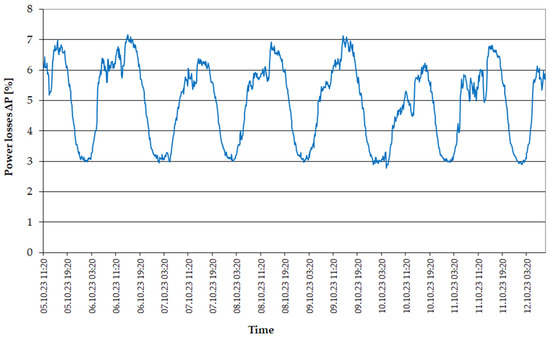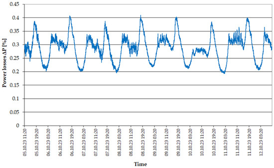 Power losses (determined on the basis of Equation (25)), resulting from the load of line 3 have an analogous course (Figure 7) to the course of (Figure 5) and range, depending on the time of day, from 3% to about 7% of the load power.