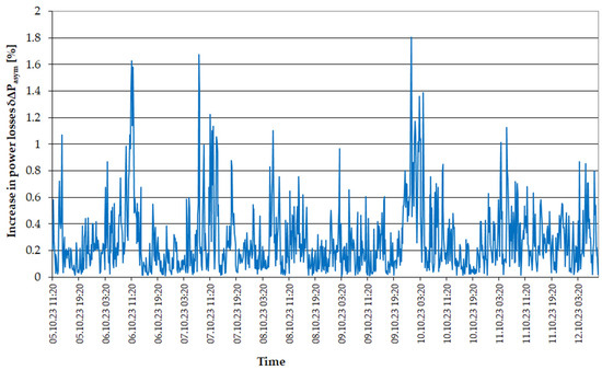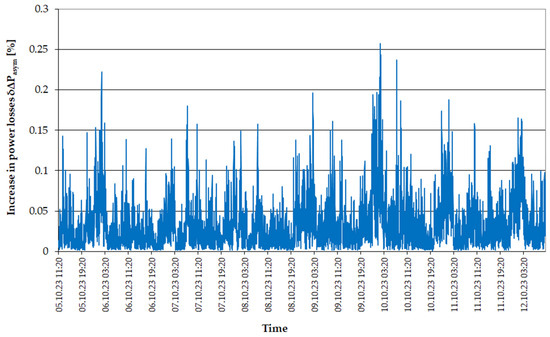 Taking into account Equation (12) and the course of registered currents asymmetry coefficients, the volatility of power loss increases in the line, caused by the asymmetry of the load currents (Figure 8), were determined. In most cases, these values do not exceed 0.6% of general losses, but at peak moments, they reach up to 1.8%. It is worth emphasizing that these losses do not show daily variability, and their course is similar to the course of the negative electricity asymmetry.