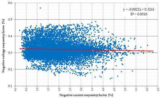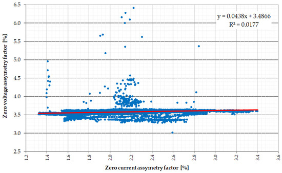 Since uneven phase load is the basic reason for the occurrence of voltage asymmetry in low-voltage networks, the authors decided to take a closer look at the relationship between voltage and current asymmetry. For this purpose, a correlation analysis was performed between voltage asymmetry (zero and negative) and current asymmetry coefficients (Figure 13 and Figure 14). The research did not confirm the relationship between these parameters in both cases. The values of R2 determination coefficients in both cases did not exceed 0.018 (for kU2(kI2) R2 = 0.018, for kU0(kI0) R2 = 0.0177), indicating a fragile relationship. It is also confirmed by the values of the calculated Pearson correlation coefficients r (for kU2(kI2) r = −0.134, for kU0(kI0) r = 0.133).