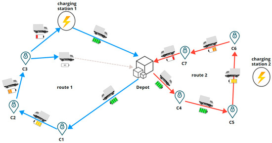 As illustrated in Figure 1, all vehicles depart from the depot with a full battery. The battery capacity decreases as the vehicle visits each node. A visit to a charging station is required whenever the vehicle’s battery is insufficient for the remaining journey. For example, in route 1, when a vehicle is returning to the depot after visiting Customer 3 (C3), the battery is insufficient, so a visit to the charging station is necessary between C3 and the depot. Conversely, as shown in route 2, a vehicle might not need to visit a charging station at all if it can return to the depot with sufficient battery capacity. This scenario is particularly relevant for companies aiming to minimize their environmental impact by using electric vehicles while still meeting delivery schedules and customer expectations.