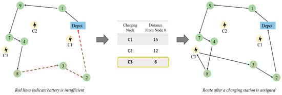 As depicted in Figure 5, the EV battery level cannot travel from node 8 to node 3. Consequently, the EV must access a charging station before visiting node 3. Among the three available charging nodes, charging node C3 is the nearest to customer node 8; thus, it becomes the chosen station to visit. This process is reiterated to ensure the feasibility of each node pair.