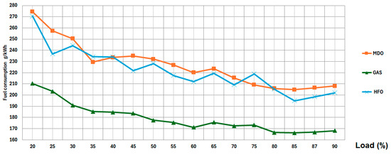 Figure 2 shows the measured data for SFOC. All measurements were carried out in the power range from 20 to 90% engine load and with three types of fuel.