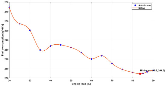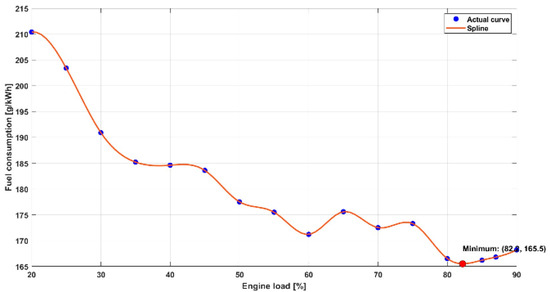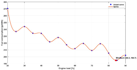 The measurements were carried out in a range of 20–90% engine load at every 10% load. After analyzing the data collected during the measurements on the ship, it was found that it is necessary to optimize the load distribution between the DF generator sets connected to the ship’s network in order to reduce fuel consumption and therefore harmful gas emissions. In order to validate the results obtained, repeated measurements were carried out between the points already measured, so that finally the measurement data were obtained in a step of 5% of the engine load and these data were considered when creating the model.