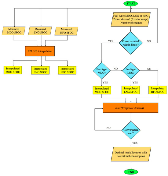 With SFOC being interpolated, it can be fed into the optimization model. The optimization model is developed using MATLAB according to the flow chart shown in Figure 6.