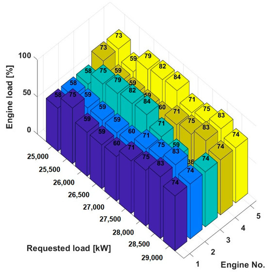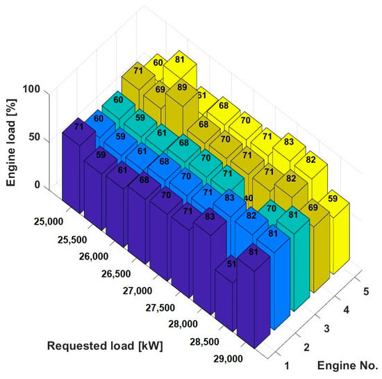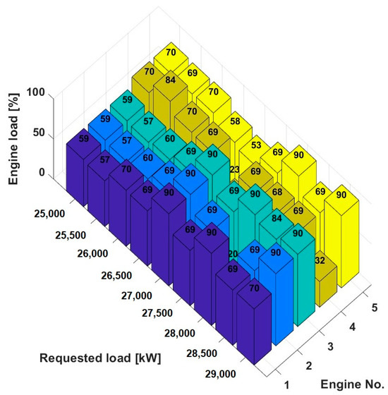 In addition, the 3D bar chart in Figure 12 shows the percentage distribution of the load across five engines in a power plant for a power range of 25,000 kW to 29,000 kW to illustrate how the load is distributed across the individual engines at different requested total outputs.