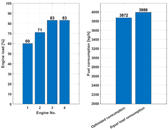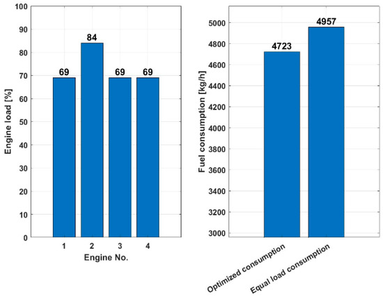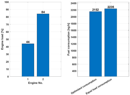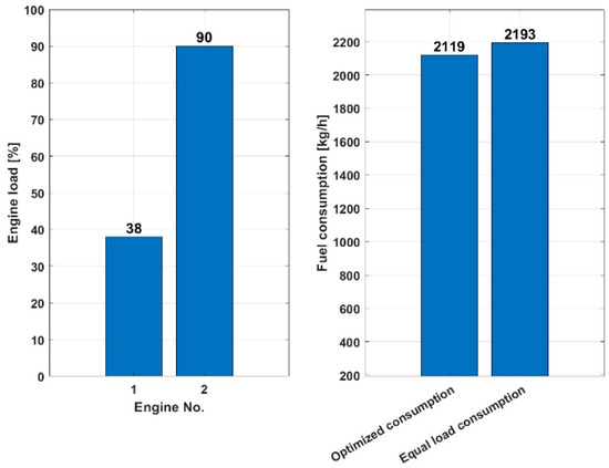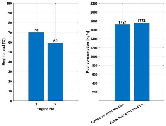 Figure 9 shows that the optimized consumption scenario for a load of 10,000 kW with two engines used consumes 2119 kg/h of fuel, while the same load-sharing consumption scenario consumes 3.37% more, 2193 kg/h of fuel, indicating that the optimized load sharing is more fuel-efficient for the given total load of 10,000 kW, as it consumes less fuel to achieve the same power.
