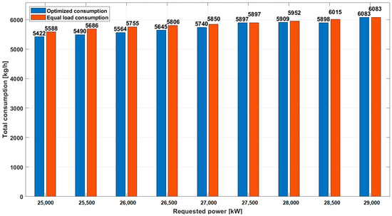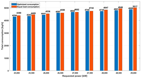 The biggest difference in this power range occurs at a load of 29,000 kW, where the optimized consumption (5017 kg/h) consumes 2.94% less fuel compared to the consumption at the equal load (4869 kg/h).