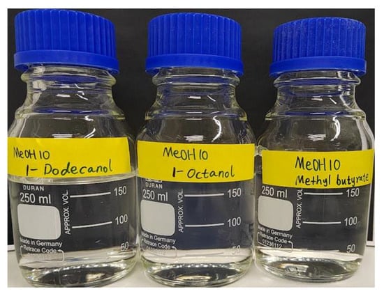 The co-solvents used for fuel blend stabilization were 1-dodecanol, 1-octanol, and methyl butyrate (Table 1). The co-solvents 1-dodecanol and 1-octanol are the products of Merck KGaA, and methyl butyrate is a product of Thermo Fisher Scientific (Waltham, MA, USA). All were purchased from VWR, Finland.
