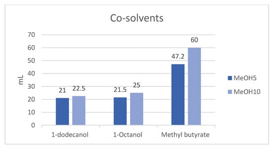 - Among the investigated co-solvents, 1-dodecanol demonstrated the highest solubilizing capacity for MeOH5 and MeOH10 blends, followed by 1-octanol;