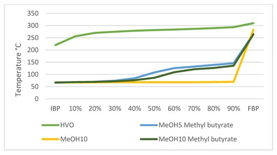 Distillation curves of the tested samples: MeOH5 methyl butyrate, MeOH10, and MeOH10 methyl butyrate. No findings were obtained for other blends due to unstable boiling conditions.