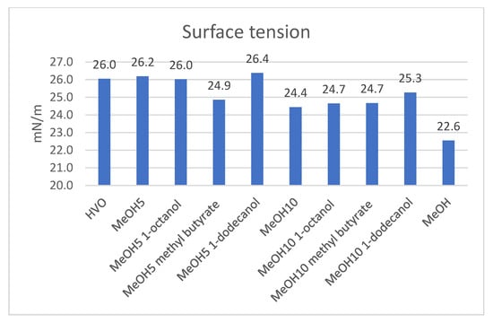 Figure 4 presents the test results of the surface tension. Following the addition of co-solvents to the MeOH5 blend, the surface tension values of MeOH5 1-octanol and MeOH5 1-dodecanol closely approximated that of MeOH5, both exceeding 26 mN m−1 and reaching the surface tension of HVO. Only the surface tension of MeOH5 methyl butyrate was lower, noted at 24.9 mN m−1. A comparison of the surface tension of MeOH10 revealed a slight increase after the addition of co-solvents, though by no more than 1 mN m−1.