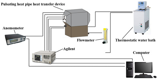The structure of the heat-exchange unit is shown in Figure 1a, which consists of copper tubes and copper elbows formed into a closed-circulation loop by soldering. The inner diameter of each copper tube and copper elbow is 0.3 cm, and the outer diameter is 0.5 cm. As shown in Figure 1b,c, the device consists of three parts: the main body of the pulsating heat pipe, the upper box, and the lower box. The lower box passes the hot water from the thermostatic tank, and the upper box is forced by the fan to dissipate the heat by convection. Figure 2 shows the experimental system for the performance test of a pulsating-heat-pipe heat exchanger with an asymmetric structure, which consists of a pulsating-heat-pipe heat exchanger with an asymmetric structure, a data collector, a thermostatic water bath, a computer and flowmeter, and a hot-wire anemometer.
