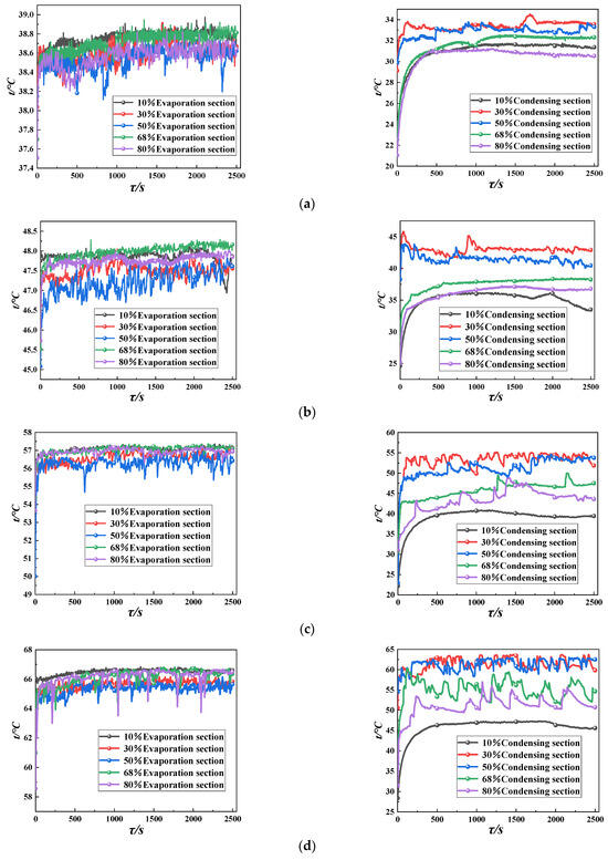 As shown in Figure 3b,c, with the increase in the heat-source temperature, except for the 10% liquid-filling rate, there is no start-up phenomenon of the pulsating heat pipe, the pulsating heat pipe starts at other liquid filling rates, and the start-up time becomes faster with the increase in the heat-source temperature. It can also be seen in the figure that with the liquid filling rate of 30% and 50%, as the heat-source temperature rises, the work material inside the tube is gradually changed from an intermittent oscillatory flow to a continuous oscillatory flow, while at the liquid filling rate of 68% and 80%, the evaporation section and the condensing section of the wall temperature began to exhibit a transient oscillatory phenomenon, but the number of oscillations is small.