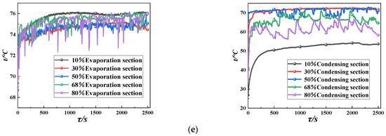 As shown in Figure 3, the wall temperature changes of the evaporating and condensing sections of the pulsating heat pipe are analyzed under different liquid filling rates. As shown in Figure 3a, when the heat source is 40 °C, the temperature curves of the evaporating section and condensing section of the pulsating heat pipe do not have any oscillation phenomenon when the liquid charging rate of the pulsating heat pipe is 10%, 68%, and 80%; the pulsating heat pipe fails to start and the temperature difference between the evaporating section and the condensing section is large, and the difference of the temperature is more than 6 °C; and the temperature curves of the evaporating section and the condensing section exhibit an oscillation phenomenon when the liquid charging rate is 30% and 50% and the pulsating heat pipe has been started—the starting time is 396 s and 503 s, respectively. When the heat pipe was started, the start-up times were 396 s and 503 s—these two liquid filling rates (of the evaporation section and the condensing section) of the temperature difference between the other three liquid filling rates, compared to the temperature difference, are smaller, and the temperature difference is 4–5 °C. This is because of the 10% low liquid-filling rate and the proportion of liquid medium in the tube being too low. However, the heat can be transferred to the condensing section through the evaporation section, it is mainly thermal conductivity-based heat transfer, the role of phase change latent heat and sensible heat in the tube is not evident, and the performance of heat transfer is poorer. This can be seen in Figure 3b–e: with the increase in the temperature of the heat source, the temperature difference between the two ends of the pulsating heat pipe become larger, and at the source of 80 °C, the temperature difference reaches 25 °C, and the difference is lower than that in the other three filling rates. At 80 °C, the temperature difference reaches 25 °C, the liquid medium is too small, the temperature of the heat source increases, leading to the phenomenon of dry burning inside the tube. Then, the heat-transfer performance of the pulsating heat pipe deteriorates, and the temperature difference between the two ends gradually increases, which does not realize the effect of efficient isothermal heat transfer. At the liquid filling rates of 30% and 50%, due to the lower temperature of the heat source, the heat provided to the evaporation section of the heat is not enough to enable the flow of the work material in the tube, and the work material in the tube remains in the start–stop–start intermittent oscillatory movement state.