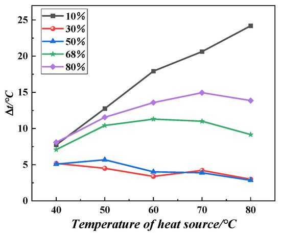 This is due to the 10% liquid-filling rate leading to too little liquid work in the tube, too many gas plugs, no formation of an effective uniform distribution of liquid plugs and gas plugs in the tube, the gas occupying almost all the space in the tube, the sensible heat and phase-change latent heat transfer of the heat being too low—mainly thermal conductivity-type heat transfer. Moreover, the liquid plugs cannot effectively take away the heat of the evaporation section, resulting in the evaporation of the section of the temperature being high, the return to the evaporation of the section of the liquid being low, the evaporation end exhibiting the burning dry phenomenon and being unable to form a continuous oscillation, the condensing section temperature being lower, the temperature difference between the two ends being larger, the temperature difference being more than 20 °C, the heat-transfer performance deteriorating, and the inability to realize isothermal heat transfer. With the liquid filling rate increased to 30–50%, the tube-liquid gas plug distribution gradually tends to be uniform. When the heat-source temperature increases, the workpiece running resistance decreases, the formation of bubbles in the evaporating end and expansion speed up, the pressure difference between the evaporation section and the condensing section increases, the driving force increases, the flow state from the oscillating flow moves into a unidirectional circulation flow, and the pulsation of the heat pipe heat-transfer performance improves. At the 30% liquid-filling rate, the heat source was 70 °C when the heat-transfer performance decreased because of the relatively small amount of liquid mass in the tube. Then, the heat-source temperature increased, the evaporation section became prone to the local evaporation phenomenon, and the condensate reflux was not timely, resulting in a decline in the performance of the heat transfer. However, when the heat-source temperature further increased, the circulation of the mass in the tube flow rate is accelerated, the condensate can exhibit timely reflux, and the pulsation of the heat-pipe heat-transfer performance is again elevated.