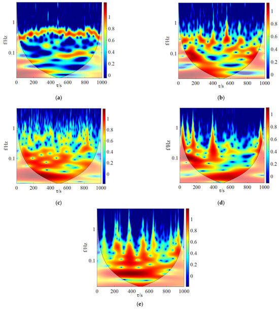 Wavelet variation of the evaporation section of the pulsating heat pipe for different liquid filling rates at 80 °C of the heat source. (a) Liquefaction rate 10%; (b) Liquefaction rate 30%; (c) Liquefaction rate 50%; (d) Liquefaction rate 68%; (e) Liquefaction rate 80%.