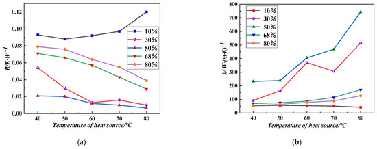 Figure 6a,b shows the variation of thermal resistance and equivalent thermal conductivity with the temperature of the heat source for different fluid filling rates. From Figure 6, it can be seen that when the liquid filling rate is 10%, the overall trend of the thermal resistance of the pulsating heat pipe increases with the increase in the temperature of the heat source, and when the temperature of the heat source is 50 °C, its thermal resistance has the smallest value of 0.088 K/W, while the equivalent thermal conductivity is the largest of 56.06 W/(m·K). When the liquid filling rate is 30%, the overall trend of thermal resistance decreases, but when the heat source is 70 °C, the thermal resistance slightly increases to 0.016 K/W, and the equivalent thermal conductivity decreases to 306.60 W/(m·K), while the thermal resistance reaches the minimum and the equivalent thermal conductivity reaches the maximum when the heat source is 80 °C. At other liquid filling rates, the thermal resistance and equivalent thermal conductivity of the pulsating heat pipe decreased and increased with the increase in the heat-source temperature. Especially at 80 °C, the heat-transfer performance of the pulsating heat pipe was the best when the liquid filling rate was 50%, with the smallest value of thermal resistance and the largest equivalent thermal conductivity. The heat-transfer performance was the worst, with the largest value of thermal resistance and the smallest equivalent thermal conductivity, when the liquid filling rate was 10%, no matter the heat-source temperature.