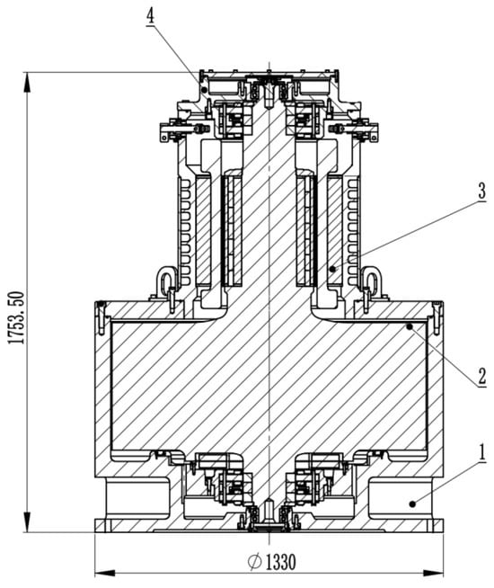 Figure 2 presents the schematic diagram of the flywheel energy storage prototype designed and developed by our team, which is primarily composed of the flywheel rotor system, high-speed motor, and magnetic bearings. The maximum energy storage capacity of the flywheel energy storage unit is 50 kWh, with the rotor material being 30Cr2Ni4MoV steel. The research in this paper is primarily based on the rotor material and rotor structure of this prototype.