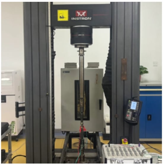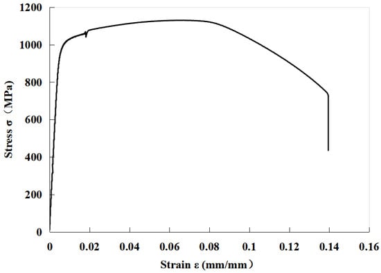The mass fractions of trace elements in the material’s chemical composition are presented in Table 1, while the equipment setup for the tensile test is illustrated in Figure 3. The mechanical properties of 30Cr2Ni4MoV alloy steel are shown in Table 2. The stress–strain curve is shown in Figure 4. The test results indicate that the yield strength of the material is 992 MPa, and its tensile strength is 1130 MPa. Typically, the yield strength of this material ranges around 760 MPa, with a higher-grade variant approximately ranging around 830 MPa []. Therefore, the results demonstrate that the tested material sample possesses excellent yield strength and tensile strength.