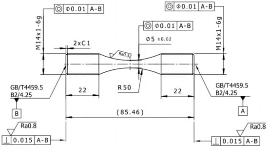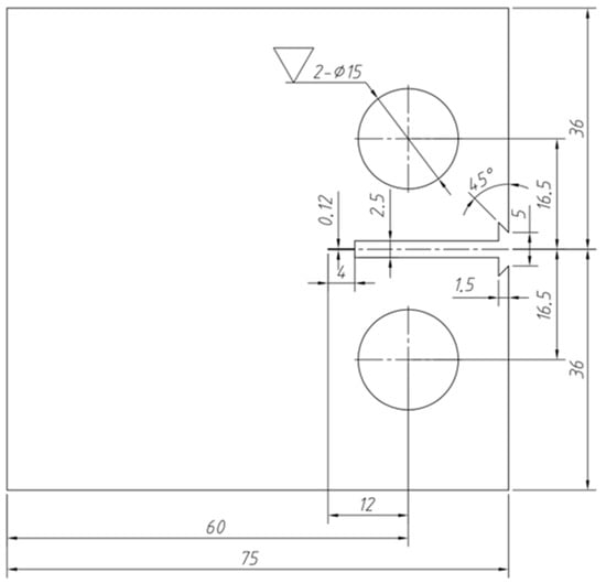 Based on the literature [,], crack propagation tensile specimens of rotor materials were designed and prepared. The configuration and dimensions of the specimens are as shown in Figure 5, with a width of 72 mm and thickness of 15 mm. The initial crack length is 4 mm.
