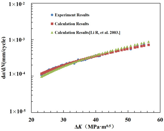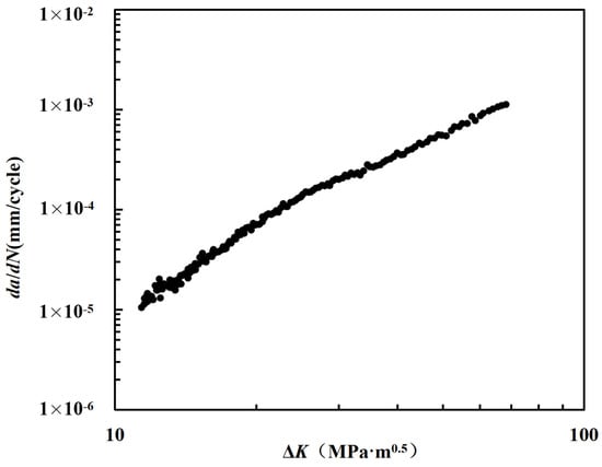 Figure 6 shows the relationship curve between the crack growth rate da/dN and the stress intensity factor range ΔK. Using the Paris formula,