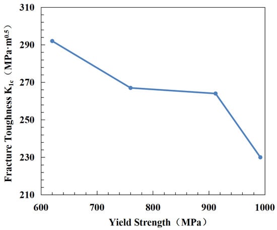 The research results indicate that the yield strength of 30Cr2Ni4MoV steel quenched at 840 °C and tempered at 600–605 °C can reach 760–900 MPa. The strength of ultra-pure 30Cr2Ni4MoV steel screen clothing quenched at 840 °C and tempered at 560–575 °C can reach 965–1035 MPa []. Different heat treatment processes can give 30Cr2Ni4MoV different yield and tensile strengths while also affecting the fracture toughness of the material. The increase in yield strength helps to improve the strength safety factor of materials during use. However, on the other hand, pursuing too high of a yield strength can lead to a decrease in the fracture toughness of materials, which is also detrimental to the safe operation of equipment. It is necessary to seek a balance between the two results. Therefore, it is necessary to explore the relationship between material fracture toughness and yield strength. Figure 8 shows the relationship between the material fracture toughness K1C and material yield strength. The results show that as the yield strength increases, the fracture toughness of the material decreases significantly. When the yield strength of the material is increased from 630 MPa to 990 MPa, the fracture toughness of the material decreases from 292 MPa∙m0.5 to 230, a decrease of 21%. This result indicates that in practical applications, one cannot blindly pursue the improvement of material yield strength.