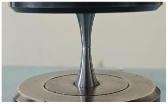 This section explores the fatigue life characteristics of 30Cr2Ni4MoV steel and conducts fatigue life tests, considering factors such as maximum stress, average stress, and the stress ratio to explore their impact on fatigue life. Figure 9 shows the fatigue testing equipment, a QBG-50 model, with a test frequency of 110 Hz. The equipment has a maximum tensile force of 250 kN and a maximum power of 3.5 kW. Figure 10 displays the dimensional specifications of the test specimen. Figure 11 shows the state of the test piece in the final stage of fatigue testing, where the test piece is in a state that is about to break but is not yet broken. From the graph, it can be analyzed that during fatigue fracture of the test piece, a crack forms from one side and gradually expands, eventually forming a crack opening until the final fracture. This process indicates that cracks are formed from the surface rather than inside the test piece.