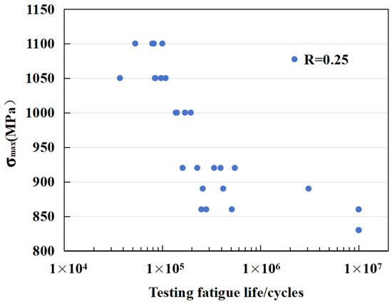 Figure 12 illustrates the relationship between fatigue life and maximum stress. To closely simulate the real operational conditions of flywheels, a stress ratio of 0.25 was employed. It can be observed from the figure that when the maximum stress decreases to 830 MPa, the material exhibits a fatigue life exceeding 107 cycles. The figure also demonstrates significant variability in fatigue life, which contributes to the challenges in achieving ideal predictions using current fatigue life models. Therefore, this paper suggests adopting a conservative design approach in fatigue life design.
