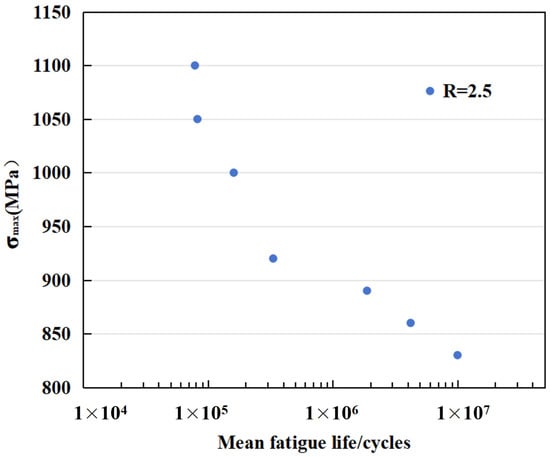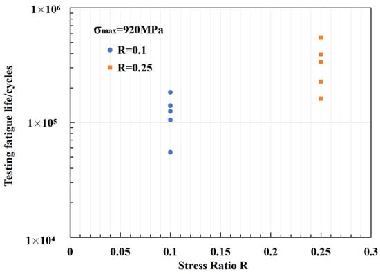 The influence of the stress ratio R on fatigue life is depicted in Figure 16. To minimize extraneous factors, the maximum stress is consistently maintained at 920 MPa. As the stress ratio increases from 0.1 to 0.25, the mean fatigue life extends from 121,600 to 332,800 cycles, a 2.7-fold increase. This indicates that, similar to lithium-ion batteries, flywheel energy storage rotors exhibit analogous lifetime characteristics, where shallow cycling promotes longevity. Despite their fundamentally distinct underlying principles, their external behaviors manifest similarities.
