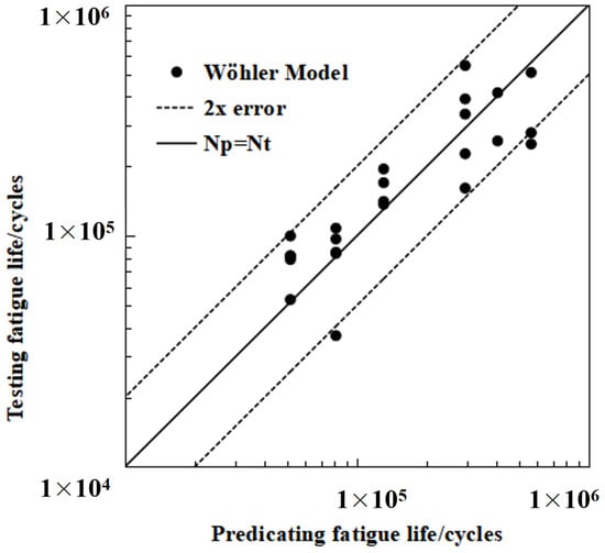 Figure 14 presents a comparison between the model calculation results and experimental test results. As shown in the figure, the majority of the model’s predicted results and the experimental measurements have errors within a factor of two, confirming that the model predictions possess a certain level of accuracy. Of course, this criterion is relatively lenient considering the variability of fatigue life.