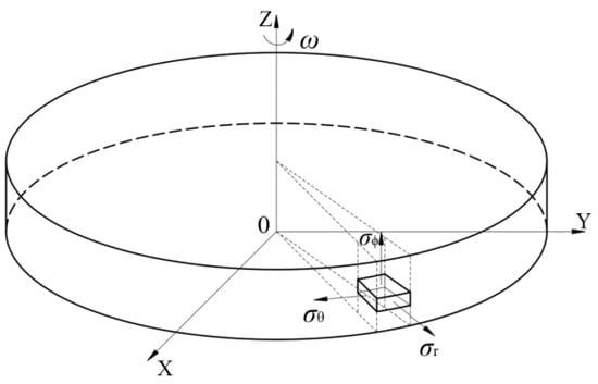 Metallic flywheels are typically designed as either thick-walled annular rings or solid disks, with the latter being a special case of the annular ring configuration. During rotation, the flywheel experiences three primary stress directions: radial stress σr, tangential stress σθ, and axial stress σϕ. As illustrated in Figure 17, the axial stress σϕ is significantly smaller than the radial σr and tangential stresses σθ. The rotor of a flywheel is primarily influenced by radial σr and tangential σθ stresses. Consequently, the centrifugal forces acting on the flywheel during high-speed rotation can be analyzed using the plane stress–strain theory.