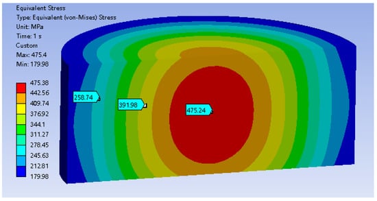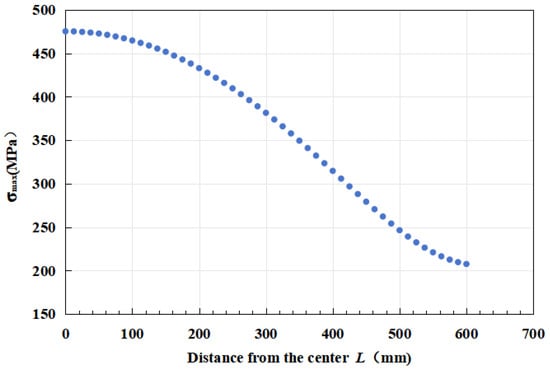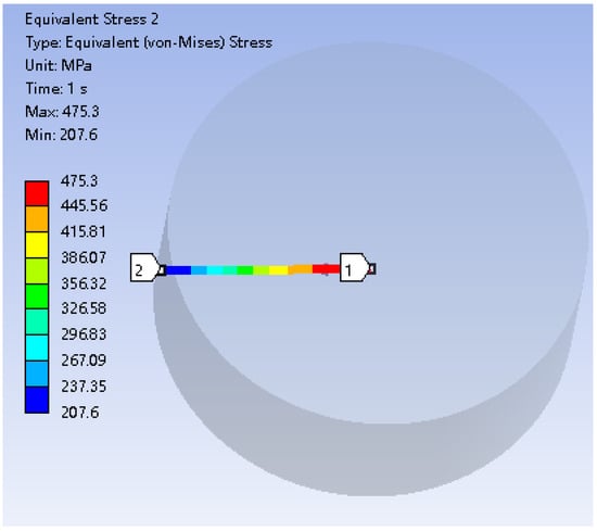 The stress distribution for this simplified model is simulated and illustrated in Figure 19. The stress distribution of the simplified structure exhibits a similar trend to that of the actual rotor structure, indicating that the simplification is valid. The maximum stress is 475.4 MPa at the core, while the stress is minimum at 180.0 MPa at the outer diameter of the rotor. Section 4.1 calculated the maximum stress in the rotor core to be 459.7 MPa using Equation (7), which shows a discrepancy of only 3% compared with the finite element analysis results, thereby demonstrating the reliability of the obtained results. It is important to note that, compared with uniaxial stress, multiaxial stress can significantly affect the fatigue life of materials. Although many researchers have conducted studies on the prediction of multiaxial fatigue life, satisfactory predictive results have not yet been achieved. Therefore, this paper does not currently consider the effects of multiaxial fatigue stress. A path was established radially from the center to the outer diameter of the rotor, as depicted in Figure 20. The stress variation along this path was analyzed, illustrating the radial stress distribution pattern of the rotor, as shown in Figure 21.