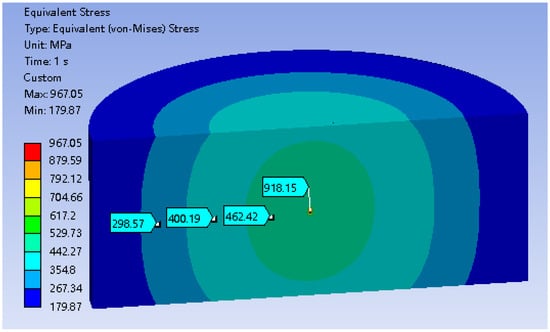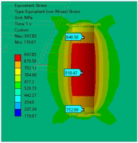 To investigate the impact of defect position on rotor stress and fatigue life, this study introduced an internal defect within the flywheel model—a cylindrical defect with a diameter of 10 mm and a height of 20 mm. For conciseness and clarity, this paper presents only the stress contour map when the defect is located at the center of the rotor. The results indicate that the presence of the internal defect increases the maximum stress in the flywheel to 967 MPa, with the highest stress being concentrated at the defect location. The overall internal stress contour map is shown in Figure 22, while the stress contour map at the defect location is depicted in Figure 23.