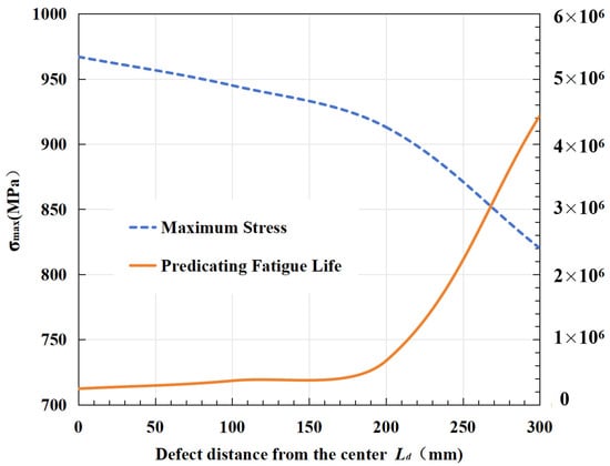 Figure 24 displays the relationship between the defect distance from the center (Ld, in millimeters) and both maximum stress (in MPa) and predicted fatigue life (in cycles). It is evident from the graph that maximum stress decreases linearly as the defect distance Ld increases, from approximately 950 MPa to 750 MPa, indicating that stress concentration diminishes as the defect moves further from the center. Conversely, the predicted fatigue life exhibits a significant nonlinear growth; as the defect location increases from 0 mm to 250 mm, the fatigue life grows from nearly 0 to over 5 million cycles.