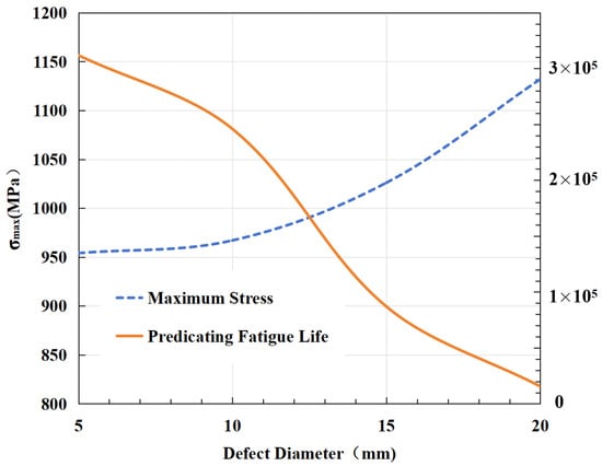 As observed, with an increase in defect diameter, there is a linear decrease in maximum stress, while the predicted fatigue life exhibits an exponential decline. Specifically, as the defect diameter increases from 5 mm to 20 mm, the maximum stress drops from nearly 1150 MPa to around 900 MPa. Simultaneously, the predicted fatigue life reduces drastically from about 350,000 cycles to nearly 0.