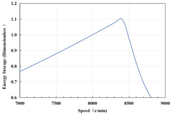 From the figure, it can be observed that as the rotational speed increases from 7000 rpm to approximately 8500 rpm, the total stored energy over the life cycle of the flywheel device shows a significant increasing trend, reaching a peak of around 1.1. However, as the speed continues to increase to 9000 rpm, the energy sharply decreases to below 0.8. In summary, the graph demonstrates an optimal point between total stored energy and rotational speed for the flywheel energy storage device, which in this case is approximately 8500 rpm.