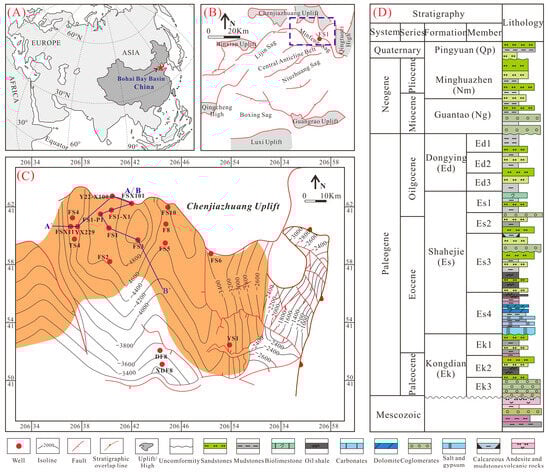 The Bohai Bay Basin, covering an area of 2 × 105 km2, is a prominent petroleum basin in eastern China (Figure 1A). Specifically, the Dongying Depression, a significant petroleum-producing subsidiary of the Jiyang Depression, is situated in the southeastern part of the Bohai Bay Basin (Figure 1B). Most of its petroleum resources are derived from the Cenozoic strata [37,38].
