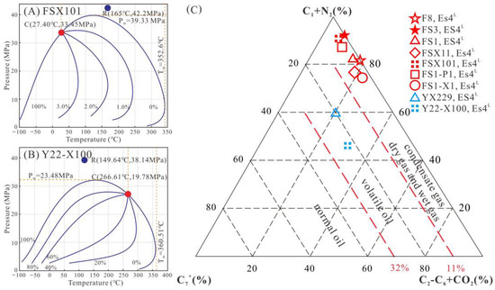 Representative pressure–volume–temperature phase diagram of the Dongying Depression condensate reservoir from well FSX101 (A) and volatile oil reservoir from well Y22-X100 (B). A triangle map for discriminating reservoir types according to molar percentage of petroleum components (C). C = critical point; Pm = cricondenbar; R = reservoir; Tm = cricondentherm.
