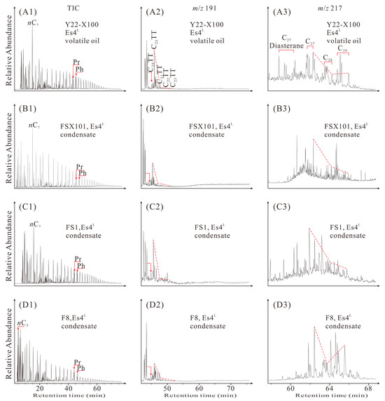 In the m/z 191 chromatograms, it is evident that short-chain tricyclic terpanes (C19–24) dominate, while long-chain pentacyclic triterpanes appear to be extensively cracked, indicating the high maturity of the oil (Figure 3).