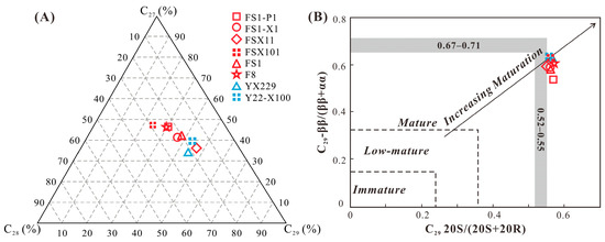 Similarly, the m/z 217 chromatograms reveal a distinctive distribution pattern among C27–C29 regular steranes, with C27 regular steranes > C28 regular sterane < C29 regular steranes (Figure 3). Interestingly, the concentrations of C27 and C29 regular steranes are approximately equal, suggesting contributions from both terrigenous and aquatic organic matter to the oils derived from the Es4L source rock (Figure 4A) [43]. Furthermore, the calculated parameters of ββ/(ββ + αα) and 20S/(20S + 20R) from various isomers of C29 steranes fall within the ranges of 0.54–0.64 and 0.55–0.57, respectively (Figure 4B, Table 2). Notably, the parameters of 20S/(20S + 20R) have reached a state of thermal evolution equilibrium, typically ranging from 0.52 to 0.55. Consequently, it can be inferred that the oil has reached a high level of maturity [41].