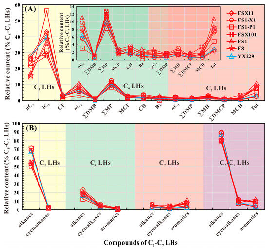 Distribution of compounds in C5–C7 LHs (A); relative contents of alkanes, cycloalkanes and aromatics in C5–C7 LHs (B).