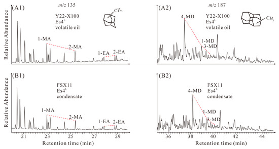 Mass chromatograms of m/z 135 (A1–B1) and m/z 187 (A2–B2) showing the distribution of some diamondoid compounds. MA = methyladamantane, EA = ethyladamantane, MD = methyldiamantane.