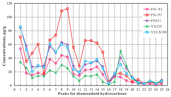 Concentrations of individual diamondoid hydrocarbons in condensate samples. (The peak number corresponds to the ordinal numbers in column 1 of Table 4).