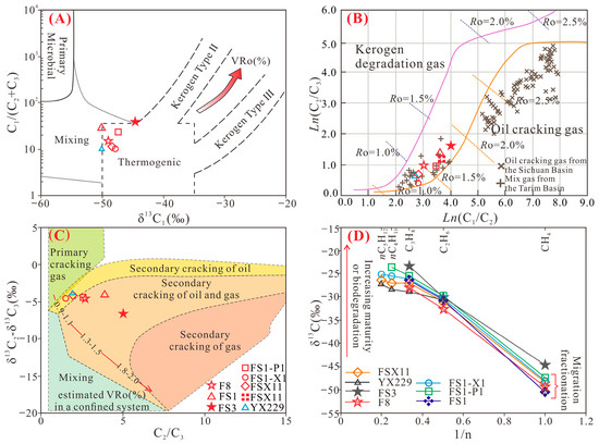 Natural gas types can be distinguished using δ13C2-δ13C3 versus C2/C3 cross-plots, including primary gas cracking, secondary oil cracking, secondary oil and gas cracking, and secondary gas cracking [54]. The gas samples from Wells FS1-X1, FSX11, and YX229 align with the zone of secondary oil cracking, while samples from Wells FS3, FS1, F8, and FS1-P1 are situated in the zone of secondary oil and gas cracking, indicating a higher maturity (Figure 8C). The equivalent vitrinite reflectance (EqVRo) distribution of gas in this area ranges from 0.9% to 1.5%.