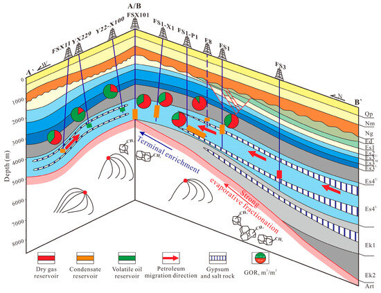 Deep Volatile and Condensate Reservoirs: Oil-cracking gas from deep reservoirs migrates into shallower oil reservoirs through fractures, resulting in the formation of light oil reservoirs (Figure 13A,B②–④). Variations in burial depth, associated pressure, and temperature give rise to the transformation of these oil reservoirs into condensate and volatile oil reservoirs. For example, F8 represents a condensate reservoir formed along a fault (Figure 13A,B②). It exhibits a CH4 percentage of 81.5%, a δ13CH4 value of −49.1‰, and an oil density of 0.72 g/cm3 (20 °C). FS1-P1 is another condensate reservoir formed along carry beds (Figure 13A,B③) with a CH4 percentage of 78.6%, a δ13CH4 value of −47.4‰, and an oil density of 0.82 g/cm3 (20 °C). YX229 represents a volatile oil reservoir (Figure 13A,B④) with a CH4 percentage of 69.1%, a δ13CH4 value of −50.2‰, and an oil density of 0.82 g/cm3 (20 °C).