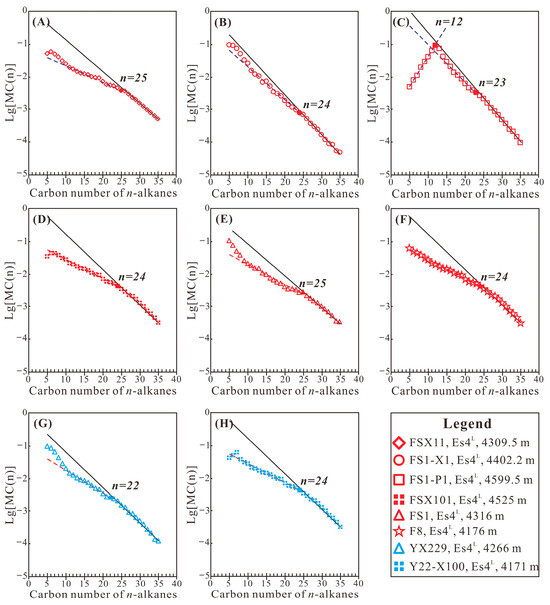 Variations of the log of mole fraction for the C5–C35 n-alkanes with carbon number, FSX11 (A), FS1-X1 (B), FS1-P1 (C), FSX11 (D), FS1 (E), F8 (F), YX229 (G), Y22-X100 (H).