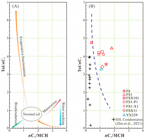 Simulation experiments and geological sample analyses reveal that residual oil following evaporative fractionation exhibits a high aromatic index and a low paraffin index [2]. Thompson (1987) introduced a B-F model diagram (Figure 11A) that utilizes aromatic index (B, Tol/nC7) and paraffin index (F, nC7/MCH) to characterize diverse secondary actions in petroleum reservoirs, considering the impact of thermal maturity, biodegradation, and washing on these parameters [2]. The analyzed oil samples exhibit nC7/MCH values ranging from 0.92 to 1.83, averaging 1.13, and Tol/nC7 values ranging from 3.29 to 4.75, averaging 4.01 (Figure 11B, Table 3). In comparison to the analysis of condensate samples from the Xihu Depression in eastern China, an area with a similar geological background to the study site and known for significant evaporative fractionation, it can be concluded that the oil samples in this study have also experienced noticeable evaporative fractionation.