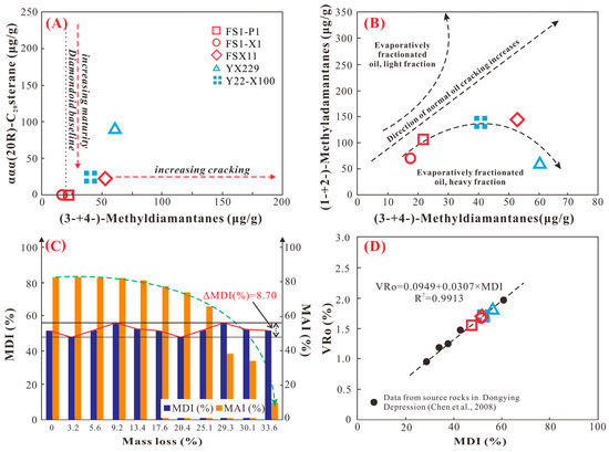 Diamondoid parameter cross-plot, concentration of ααα(20R)-C29 sterane versus concentration of (3- + 4-) MD (A) (after [63]), concentration of (1- + 2-) MA versus concentration of (3- + 4-) MD (B) (after [65]), Change of MAI and MDI with evaporation fractionation intensity (C) (after [67]), MDI versus VRo (D) (Source rocks data from [68]).